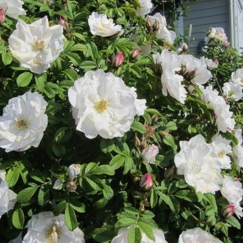 Бутоны с розово-красными полосками. Цветки диаметром 8 см, полумахровые белые с жёлтыми тычинками, в соцветиях по 3-5. Аромат сильный. Цветение почти непрерывное с конца июня до середины сентября. После цветения образуются красные декоративные плоды. Листва серовато-зелёная, матовая, бархатистая на ощупь, высокоустойчивая к болезням. Куст высотой 150-200 см, шириной 120 см. Побеги слабооколюченные. Зимует под устойчивым снежным покровом. Зона 3 (до -34ºС).