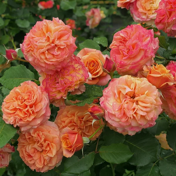 Желтые махровые цветы с медным оттенком и розовыми внешними лепестками очаровательны на фоне темно-зеленой, плотной, глянцевой и здоровой листвы и станут подлинным украшением сада. Аромат — мягкий, цветение — почти непрерывное. Куст сильнорослый, прямостоячий, пушистый. Хорошая устойчивость к заболеваниям — практически не поражается черной пятнистостью и мучнистой росой. Среднее кол-во лепестков 100.