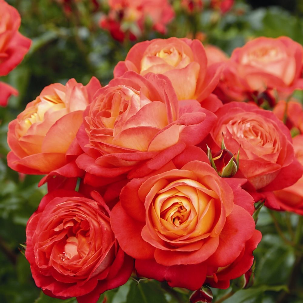 Выразительный сорт. Цветки средних размеров, насыщенного оранжево-красного цвета с желтой изнанкой лепестков, густомахровые, квартированные. Появляются в небольших кистях на крепких цветоносах. Очень выносливая роза.