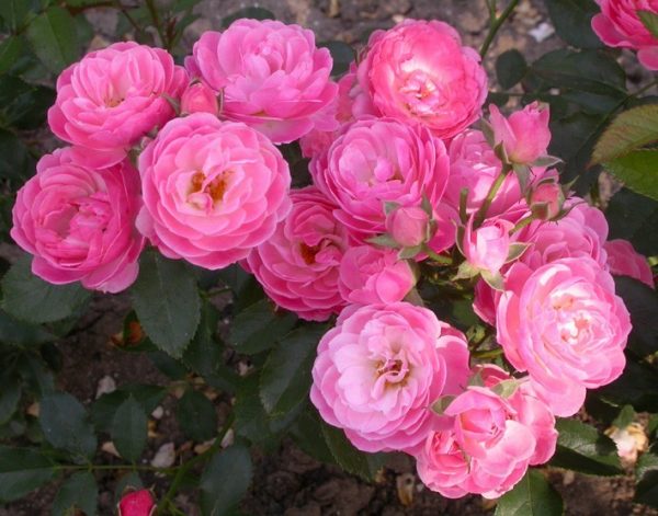 Отличный гибрид розы мускусной. Цветки махровые, чашевидные, с перекрывающимися лепестками. В основании лепестки желтые, но общая окраска цветков- розовая. Под их тяжестью сгибаются длинные стебли. Куст быстро растет и довольно рано зацветает. Листья крупные, темно-зеленые, с красивым блеском. Кол-во цветков на стебле: 5-10.
